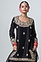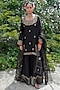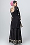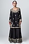 Featuring a black short kurta in silk chanderi base with hand and machine embroidery, including cutwork detail. It is paired with silk chanderi sharara pants having machine embroidery and silver zari hem, including a silk organza dupatta. Accentuate with statement earrings and heels for festive occasions or wedding ceremonies.