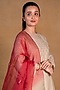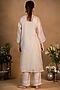 Featuring a sage green kurta in chanderi silk base with thread and zardosi embroidery. It is paired with matching cotton silk pants and a maroon shaded organza dupatta.