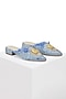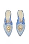 Featuring a pair of blue mules in brocade and organza base with 24kt gold plated textured petals, heart motif and organza frills. It has 1-inch heels. Style it with ethnic or Indo-western outfits, keeping jewellery minimal to highlight the embroidery. Perfect for weddings, festive functions, sangeet and elegant evening events.