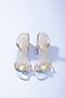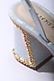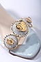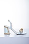 Featuring a pair of blueberry block heels in holographic vegan leather base with glass cut beads and 3D gold metal heart hand embellishments, including a circular treat strap. It has 3-inch heels. Perfect wear for a wedding or festive occasion.