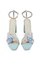 Featuring a pair of mint and lilac feathered block heels in power mesh and vegan leather base with glass-cut beads, leaf motifs, glossy shell beads and rose quartz cabochon stone hand embroidery. It has 3-inch heels and slender ankle straps. Perfect wear for a wedding or festive occasion.