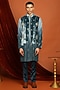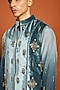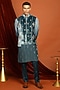 Featuring a blue bundi jacket in velvet base with crystal, pearl and beads embroidery. It is paired with an ombre habutai silk embroidered kurta and pants. Style it with shoes for a festive occasion, cultural event, wedding, sangeet or engagement ceremony.