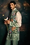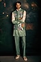 Featuring a green bundi jacket in sequins base with floral detailing. It is paired with a satin ombre kurta and suiting trousers. Style it with loafers for a festive occasion, cultural event, wedding, sangeet or engagement ceremony.
