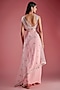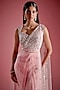 Featuring a pink blouse in tulle base with pearls, metallic floral and sequins work. It is paired with a georgette skirt, a kaftan-style drape having pearls, metallic leaves and floral scatter embroidery, including a belt having metallic accents. Accentuate it with statement earrings, a sleek clutch, and embellished heels for an effortlessly elegant look?perfect for weddings, festive celebrations, or evening soirees.