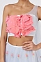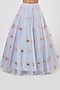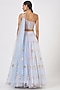 Featuring a powder blue lehenga in tulle base with booti embroidery. It is paired with a matching one shoulder blouse having embroidery.