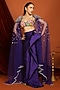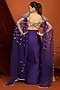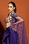Featuring a purple cape in tulle base with pearl embroidery. It is paired with a multi-colored bustier having bead embroidery and a purple taffeta skirt. Accentuate it with statement jewellery and heels for sangeet ceremonies.