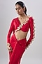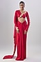 Featuring a red draped gown saree in lycra base with thigh-high slit detail. It is paired with a blouse having trail detail, gold metal, swarovski stones and gold hand embroidery. Accentuate it with kundan polki or meenakari jewellery, embellished heels and a potli bag for an elegant look, perfect for weddings, sangeet ceremony or a bridal look.
