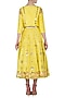 Featuring a yellow mid calf lenght skirt in raw silk base embellished with gold sequins and arcylic mirrors. It is paired with a peach bralette and a yellow embellished jacket and gold leather belt.