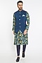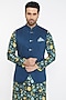 Featuring a blue bundi jacket in cotton jacquard base. It is paired with a matching slub silk and spun silk printed kurta and pants.
