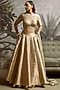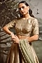 Featuring a green lehenga in banarasi silk base with print. It is paired with a blouse having a round neckline and a flat chiffon dupatta. Accentuate it with polki jewellery, a potli bag and block heels for a wedding, sangeet or engagement ceremony.