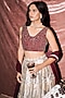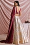 Featuring a wine lehenga in banarasi tissue base with geometric print. It is paired with a flat silk embellished blouse and a flat chiffon dupatta. Accentuate it with polki jewellery, a potli bag and block heels for a wedding, sangeet or engagement ceremony.