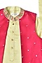 Featuring a rani pink open achkan jacket in silk base with embroidery. It is paired with a contrasting pista green kurta and pants.