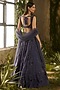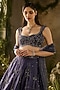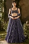 Featuring a denim blue lehenga in satin organza and velvet base with floral embroidery. It is paired with a deep neckline blouse having sequins and bead embroidery, including a dupatta. Style it with polki earrings, block heels and an embellished clutch, perfect for diwali celebrations, weddings or sangeet ceremonies.