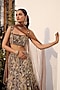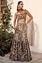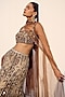 Featuring a mocha brown fish-cut lehenga in tokyo mesh base with sequins, zari and zardosi embroidery, including silk tissue applique work. It is paired with a hand embroidered blouse and a mesh dupatta. Accentuate it with statement earrings and heels for sangeet or wedding ceremonies.