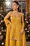 Featuring a mustard kurta in organza and linen satin base with zardosi and sequins hand embroidery. It is paired with sharara pants and a dupatta. Accentuate it with dangler earrings and heels for haldi ceremonies.