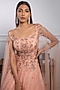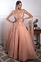 Featuring a peach gown in organza base with floral 3D motif embellishments, hand embroidery, and sheer long sleeves.