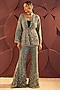 Featuring a teal jacket in silk organza base with zardosi hand embroidery. It is paired with matching pants having embroidery, a velvet inner, and a belt.