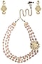 Featuring a gold finish triple line necklace with opera pink gems and antique gold balls. It is paired with a matching pair of earrings, set in alloy.