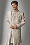 Featuring an ash grey sherwani in mulberry silk base with dori and resham embroidery. It is paired with pants and a shawl. Style it with a match and mojaris for a wedding or engagement ceremony, exuding traditional charm and elegance.