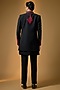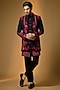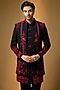 Featuring a black textured indowestern in suiting base with red dori embroidery. It is paired with a vest and trousers. Style it with pair of loafers and a bracelet for a sangeet or cocktail ceremony.