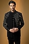 Featuring a black bandhgala in suiting base with embroidery. It is paired with a vest and trousers. Style it with pair of loafers and a bracelet for a sangeet or cocktail ceremony.