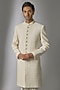 Featuring a cream sherwani in double georgette base with moti embroidery. It is paired with pants. Style it with a safa and pair of mojaris for a wedding, sangeet or engagement ceremony.