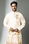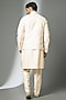 Featuring a cream bundi jacket in silk base with floral print, motis and cutdana hand embroidery. It is paired with a kurta and pants. Accentuate it with classic mojris or embroidered loafers and a subtle brooch on the bundi for a refined ensemble, ideal for festive celebrations, wedding functions or traditional family gatherings.