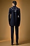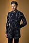 Featuring a deep navy indowestern in suiting base with cutdana, beads and sequins embroidery. It is paired with trousers. Style it with pair of loafers and a bracelet for a sangeet or cocktail ceremony.
