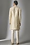 Featuring a gold sherwani in chanderi silk base with moti, mirror, pearl and cutdana embroidery. It is paired with pants. Perfect wear for a wedding, engagement, or sangeet ceremony.