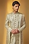 Featuring a green gold sherwani in shimmer tissue base with zardosi and resham hand embroidery. It is paired with pants and a shawl. Style it with pair of mojaris, a safa and a mala for a traditional look, Perfect wear for your wedding or engagement ceremony.