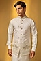 Featuring an ivory nehru jacket in chanderi silk base with embroidery. It is paired with a kurta and pants. Style it with pair of mojaris and a bracelet for festive occasions or pooja ceremony.