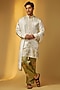 Featuring an ivory short kurta in linen satin base with embroidery. It is paired with chanderi silk printed palazzo and a shawl. Style it with pair of kolhapuris and a bracelet for festive occasions or sangeet ceremony.