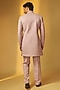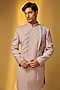 Featuring a lavender indowestern in suiting base with brush paint. It is paired with trousers. Style it with pair of loafers and a bracelet for a sangeet or reception ceremony.