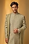 Featuring a sage green sherwani in chanderi silk base with cutdana, moti, pearls and beads embroidery. It is paired with pants and a shawl. Style it with pair of mojaris, a safa and a mala for a traditional look, Perfect wear for your wedding or mehendi ceremony.