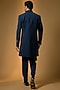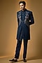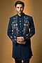 Featuring a teal blue indowestern in suiting base with brush paint, including cutdana and motif embroidery. It is paired with a vest and trousers. Style it with pair of loafers and a bracelet for a sangeet or wedding ceremony.