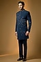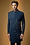 Featuring a teal blue indowestern in suiting base with cutdana and beads embroidery. It is paired with trousers. Style it with pair of loafers and a bracelet for a sangeet or wedding ceremony.