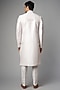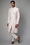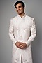 Featuring a white sherwani in imported mulberry silk base with moti and cutdana handwork. It is paired with polo pants. Perfect for a wedding or engagement ceremony.