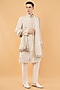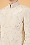 Featuring an ivory sherwani in silk base with hand and machine embroidery. It is paired with a kurta, trousers and a dupatta. Style it with mojaris and malas for wedding, engagement or sangeet ceremonies.
