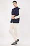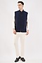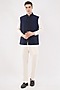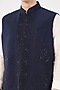 Featuring a navy blue waistcoat in silk base with geometric embroidery. Style it with a kurta set and mojaris for wedding, engagement or sangeet ceremonies.