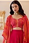 Featuring a cherry red blouse in organza base. It is paired with matching georgette palazzo pants and a jacket.