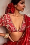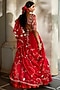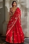 Featuring a cherry red lehenga in pure organza base with aari and zardosi hand embroidery. It is paired with a chiniya blouse and a pure organza dupatta. Style it with zircon or polki jewellery, soft curls and embellished heels, perfect for weddings or sangeet ceremony.