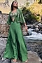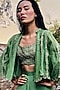 Featuring a fern green jacket in organza base with dabka, mirror, cutdana and zari embellishment. It is paired with a matching geometric printed blouse and crepe palazzo pants.