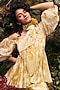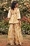 Featuring a golden yellow peplum in malai chanderi base with print, balloon sleeves and french knot embroidery. It is paired with palazzo pants and a scarf. Accentuate it with statement earrings and heels for a festive look.