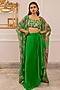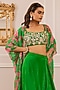 Paulmi & Harsh presents a green kaidar jacket in georgette base with floral print. It is paired with a chiniya silk blouse having sequins, beads and resham embroidery, including a crepe draped skirt. Style this set with soft waves and minimal jewellery, perfect for daytime weddings, garden parties, or mehendi ceremonies.