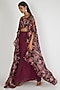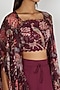 Featuring a purple jacket in viscose crepe base with cheet print. It is paired with a matching viscose organza embroidered crop top and georgette palazzo pants.