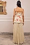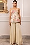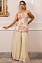 Paulmi & Harsh presents an off-white corset style kurta in georgette base with floral print, pitta and crystal hangings detail. It is paired with palazzo pants. Style these breezy floral ensembles with delicate earrings and strappy sandals, perfect for resort vacations, brunch dates, or summer garden parties.