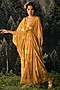 Featuring an orange maxi dress in crepe base with geometric print. It is paired with an organza knotted jacket and a belt. Accentuate it with statement earrings and heels for vacation wear.