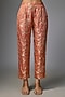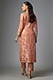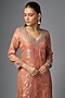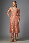 Featuring a peach kurta in jamawar jacquard base with jaal pattern, hand painted print and zardosi embroidery. It is paired with straight cut pants. Accentuate it with jhumka earrings and juttis for festive wear, family gatherings or pooja ceremonies.