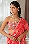 Paulmi & Harsh presents a peony pink ruffled saree in georgette base with floral print. It is paired with a chiniya silk hand embroidered blouse. Style this set with soft waves and minimal jewellery, perfect for daytime weddings, garden parties, or festive luncheons.