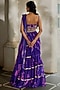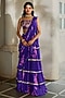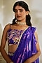 Featuring a purple pre-stitched saree in chiffon base with floral print. It is paired with a chiniya printed blouse and a hand embroidered belt. Style it with zircon jewellery, soft curls and embellished heels, perfect for weddings or sangeet ceremony.